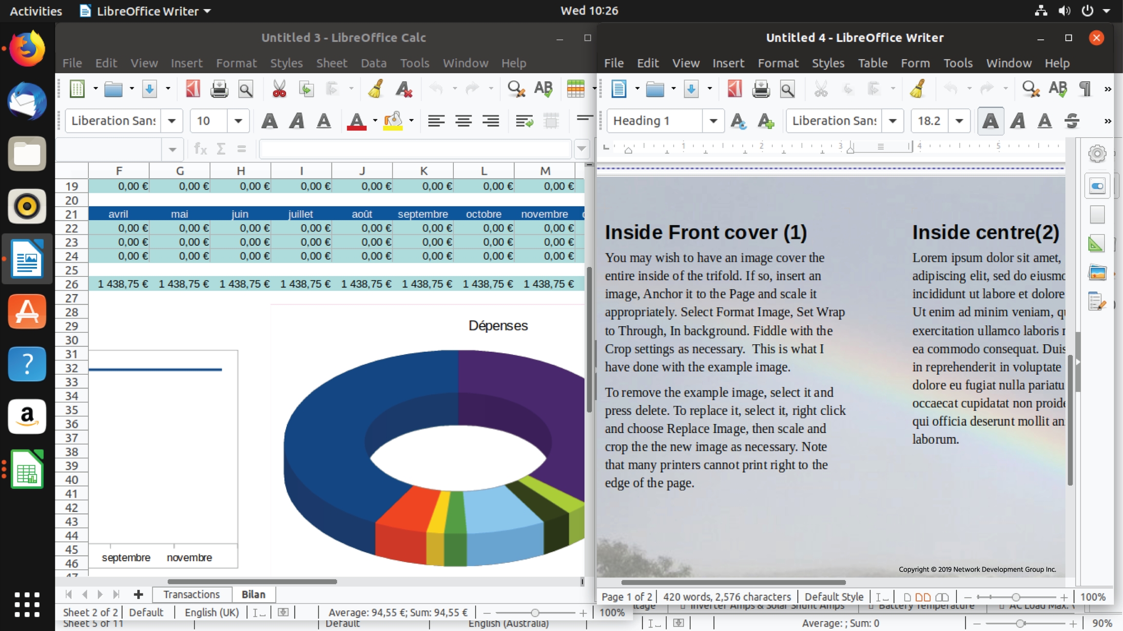 Ниже показана электронная таблица и редактор документов LibreOffice. Обратите внимание, что электронная таблица LibreOffice Calc не ограничена строками и столбцами чисел. Числа могут быть источником графика, а формулы могут быть написаны для расчета значений на основе информации, такой как объединение процентных ставок и сумм кредита, чтобы помочь сравнить различные варианты заимствования.