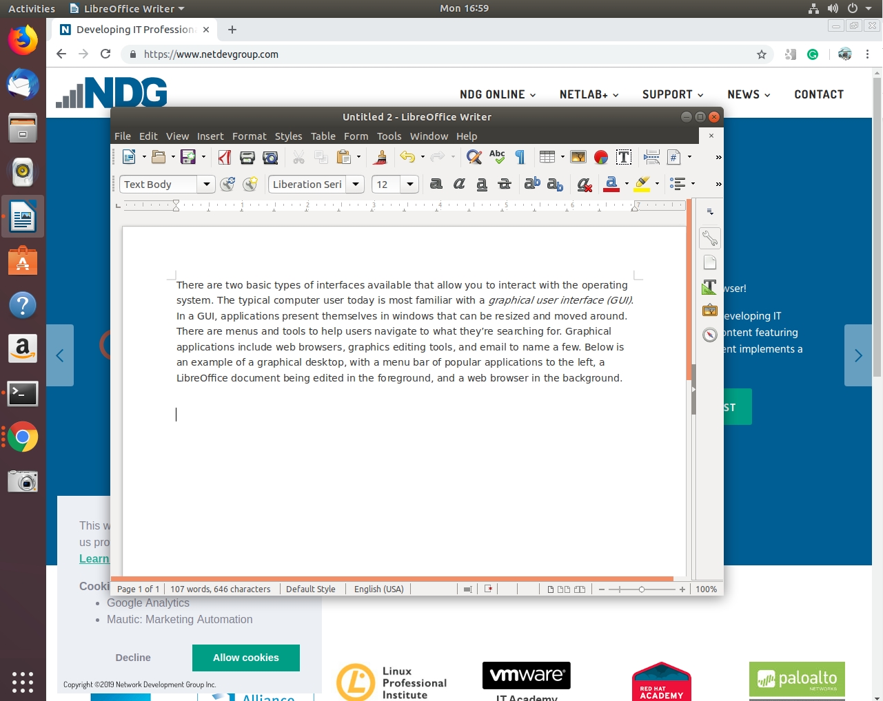Как и большинство операционных систем, Linux можно использовать одним из двух способов: графическим (GUI) и неграфическим (CLI). Ниже приведен пример графического рабочего стола со строкой меню популярных приложений слева, редактируемым документом LibreOffice на переднем плане и веб-браузером на заднем плане.